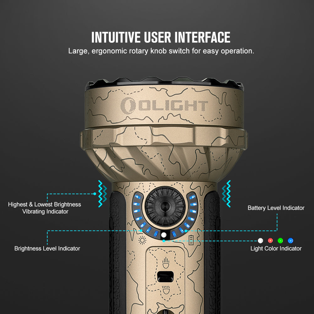 Switch between long-distance spotlight and close-range floodlight with the twist of the intuitive rotary knob. The built-in battery is rechargeable via Olight’s magnetic MCC3 charging system, and side indicators keep you aware of battery and output levels at a glance.